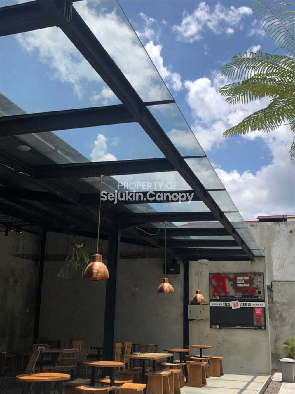 Canopy kaca tebal yang memberi kesan mewah, rapi, dan modern. Tahan panas, anti gores, dan sangat cocok untuk area depan rumah, koridor, atau ruang semi-outdoor.