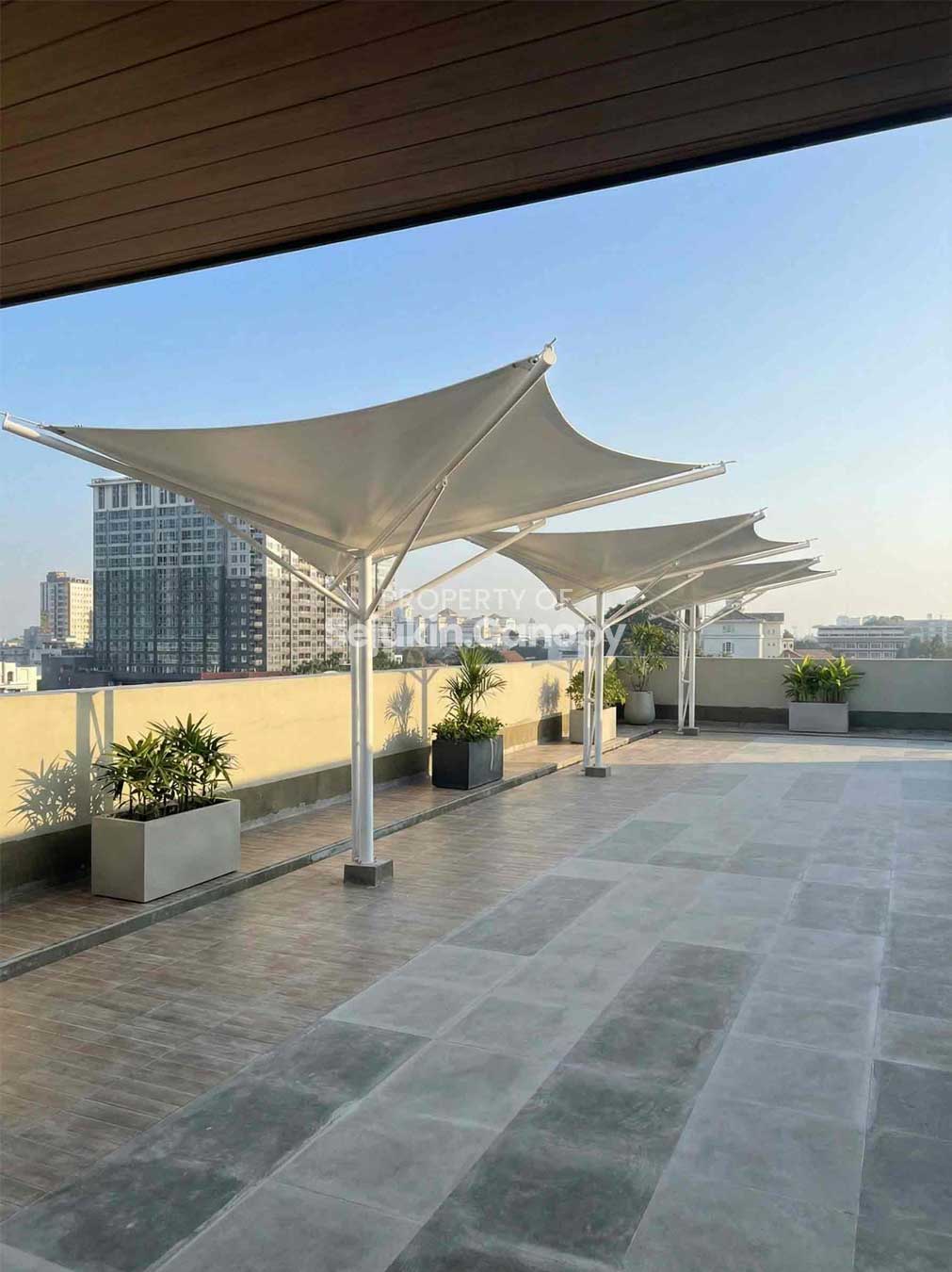 Canopy premium dengan bahan membrane tensile yang kuat, modern, dan memberikan kesan arsitektur mewah. Tahan panas dan cocok untuk area luas seperti taman, kolam renang, atau fasilitas publik.